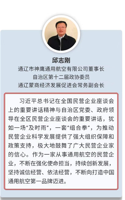 通遼市神鷹通用航空有限公司董事長(zhǎng)、自治區(qū)政協(xié)第十二屆委員會(huì)委員邱志剛,作為自治區(qū)企業(yè)家代表應(yīng)邀參加了此次座談會(huì)。會(huì)后,按照自治區(qū)統(tǒng)戰(zhàn)部的統(tǒng)一部署,提交了參加座談會(huì)的收獲與感受,表示:一定要認(rèn)真貫徹布小林主席講話(huà)精神,不斷在強(qiáng)化使命擔(dān)當(dāng),持續(xù)創(chuàng)新發(fā)展,堅(jiān)持誠(chéng)信經(jīng)營(yíng)、依法經(jīng)營(yíng)上下功夫,不斷向中國(guó)通用航空第一品牌邁進(jìn)。